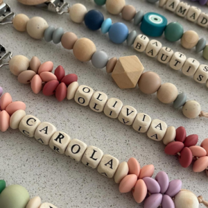 Portachupetes/mordillos de silicona y juguetes de madera.